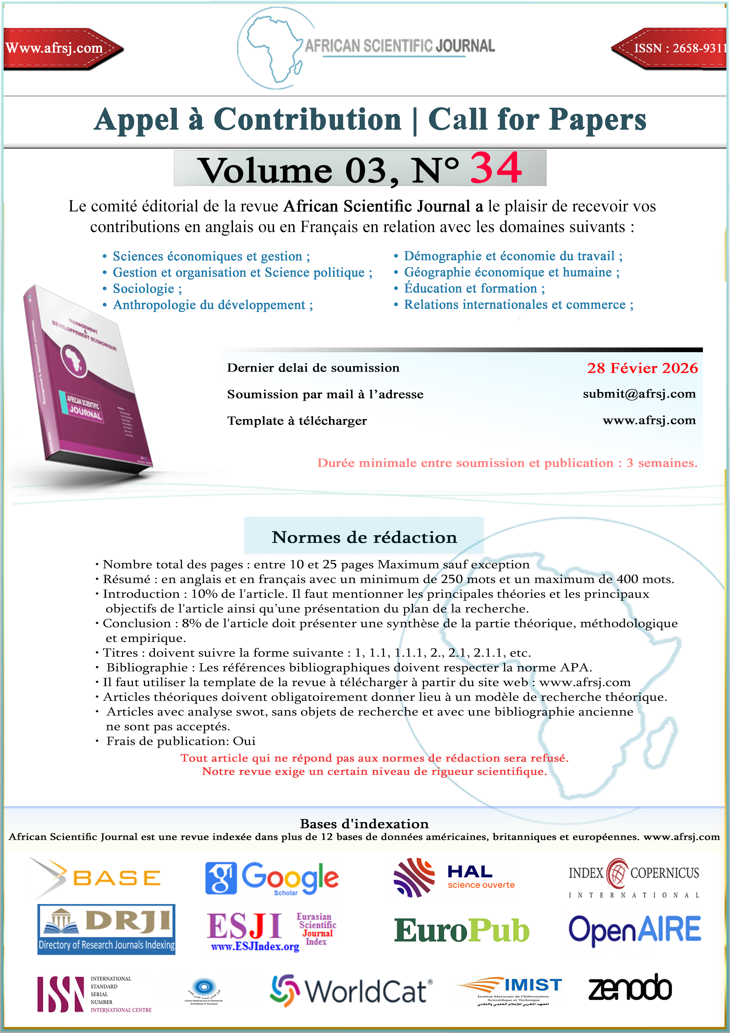 • Articles théoriques doivent obligatoirement donner lieu à un modèle de recherche théorique. • Articles avec analyse swot, sans objets de recherche et avec une bibliographie ancienne ne sont pas acceptés. • Frais de publication: Oui Tout article qui ne répond pas aux normes de rédaction sera refusé. Notre revue exige un certain niveau de rigueur scientifique.